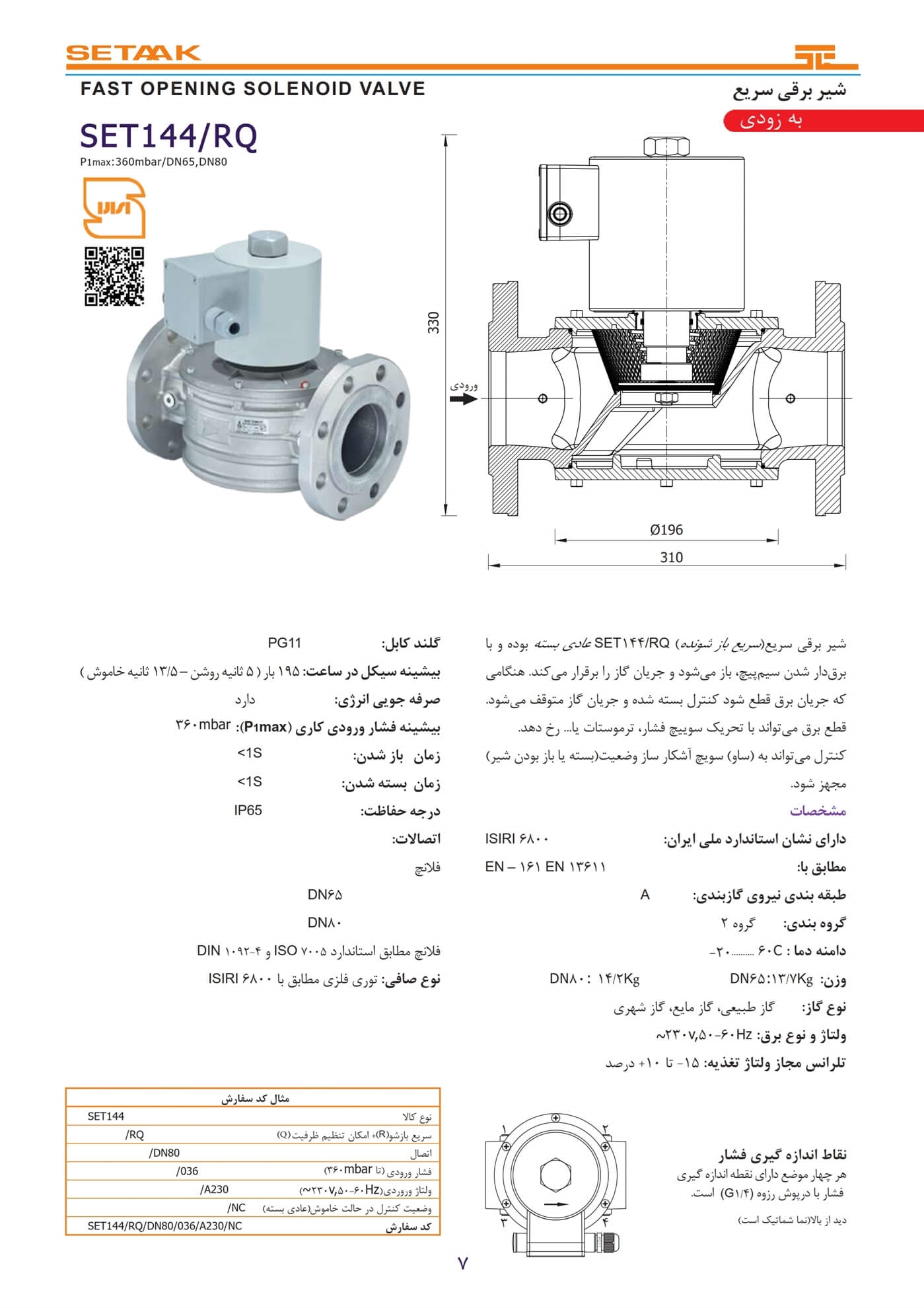 شیر برقی سریع(سریع باز شونده) SET144/RQ عادی بسته بوده و با برقدار شدن سیمپیچ، باز میشود و جریان گاز را برقرار میکند. هنگامی که جریان برق قطع شود کنترل بسته شده و جریان گاز متوقف میشود. قطع برق میتواند با تحریک سوییچ فشار، ترموستات یا... رخ دهد. کنترل میتواند به (ساو) سویچ آشکار ساز وضعیت(بسته یا باز بودن شیر) مجهز شود.